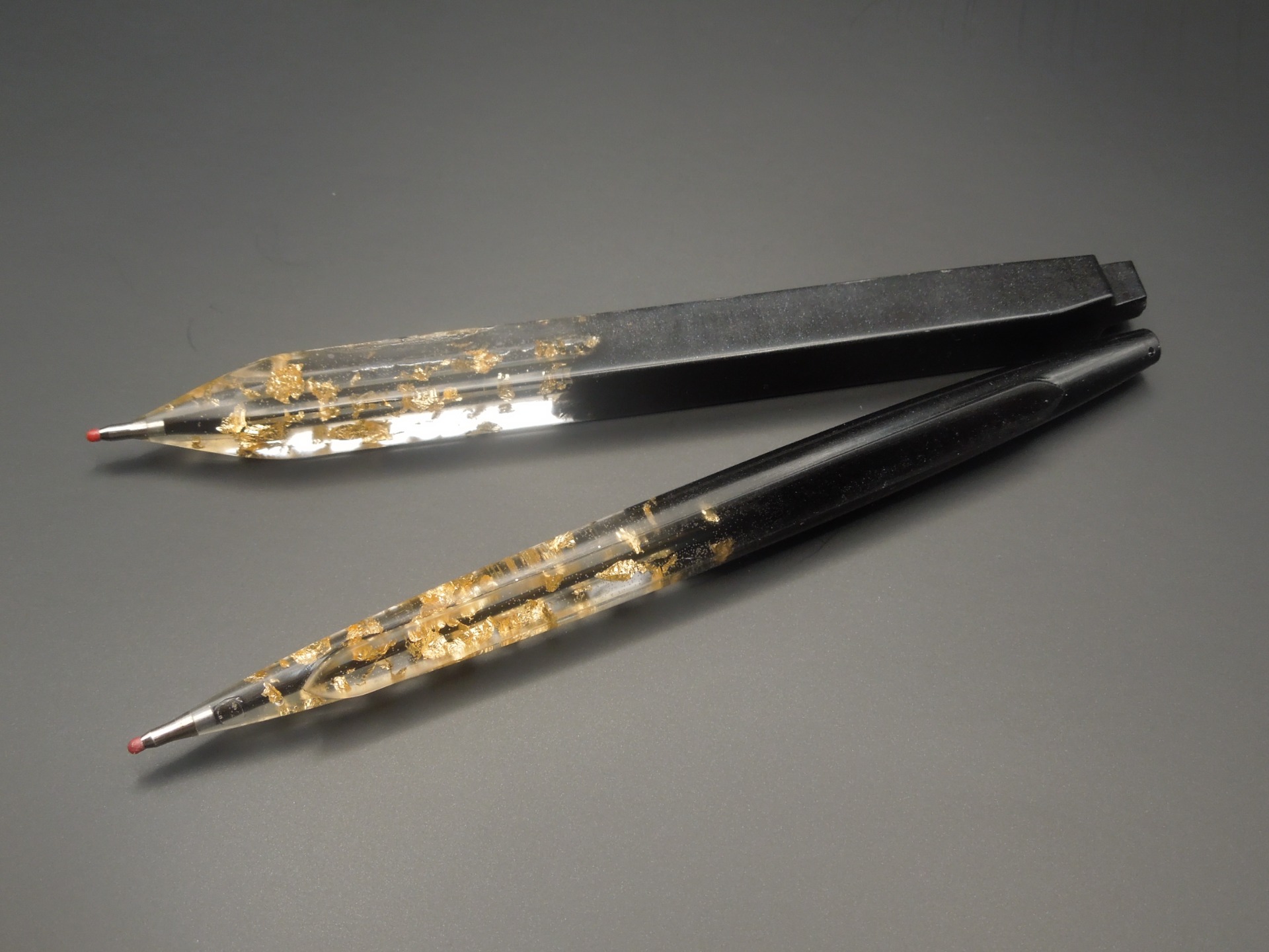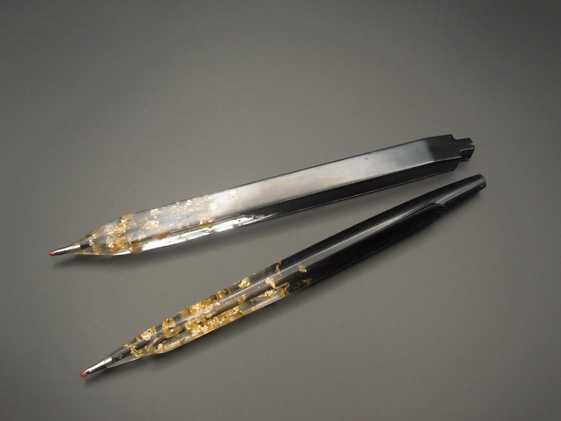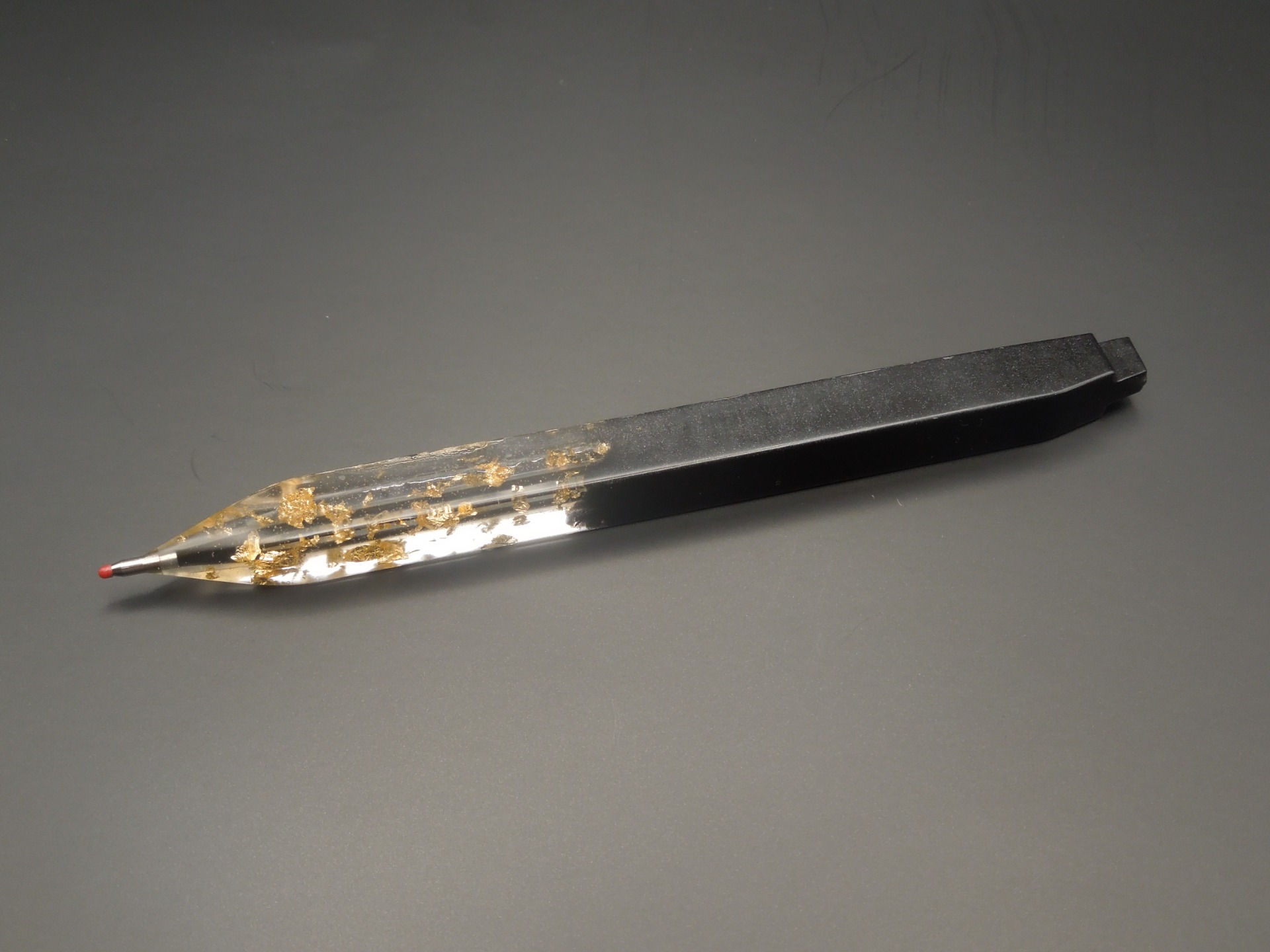 Pozvedněte svůj styl při každém podpisu. Toto ručně vyráběné pero kombinuje moderní minimalistický design s nádechem luxusu. Průhledná část těla pera ukrývá stovky jemných plátků pravého dekoračního zlata, které vytvářejí fascinující odlesky při každém pohybu ruky.