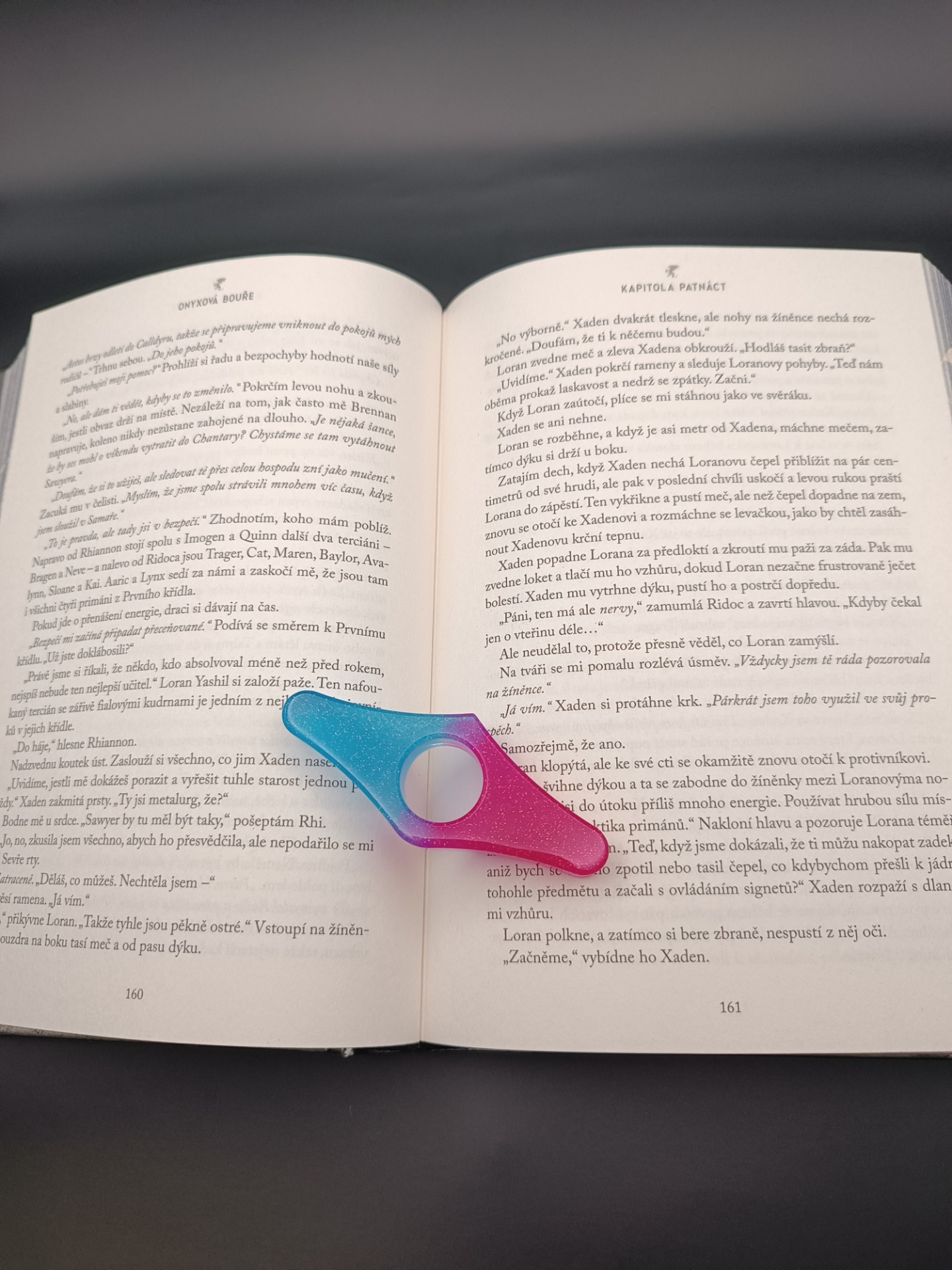 - Ergonomický tvar: Stačí provléknout palec otvorem a přiložit na hřbet otevřené knihy – stránky drží jako přibité.