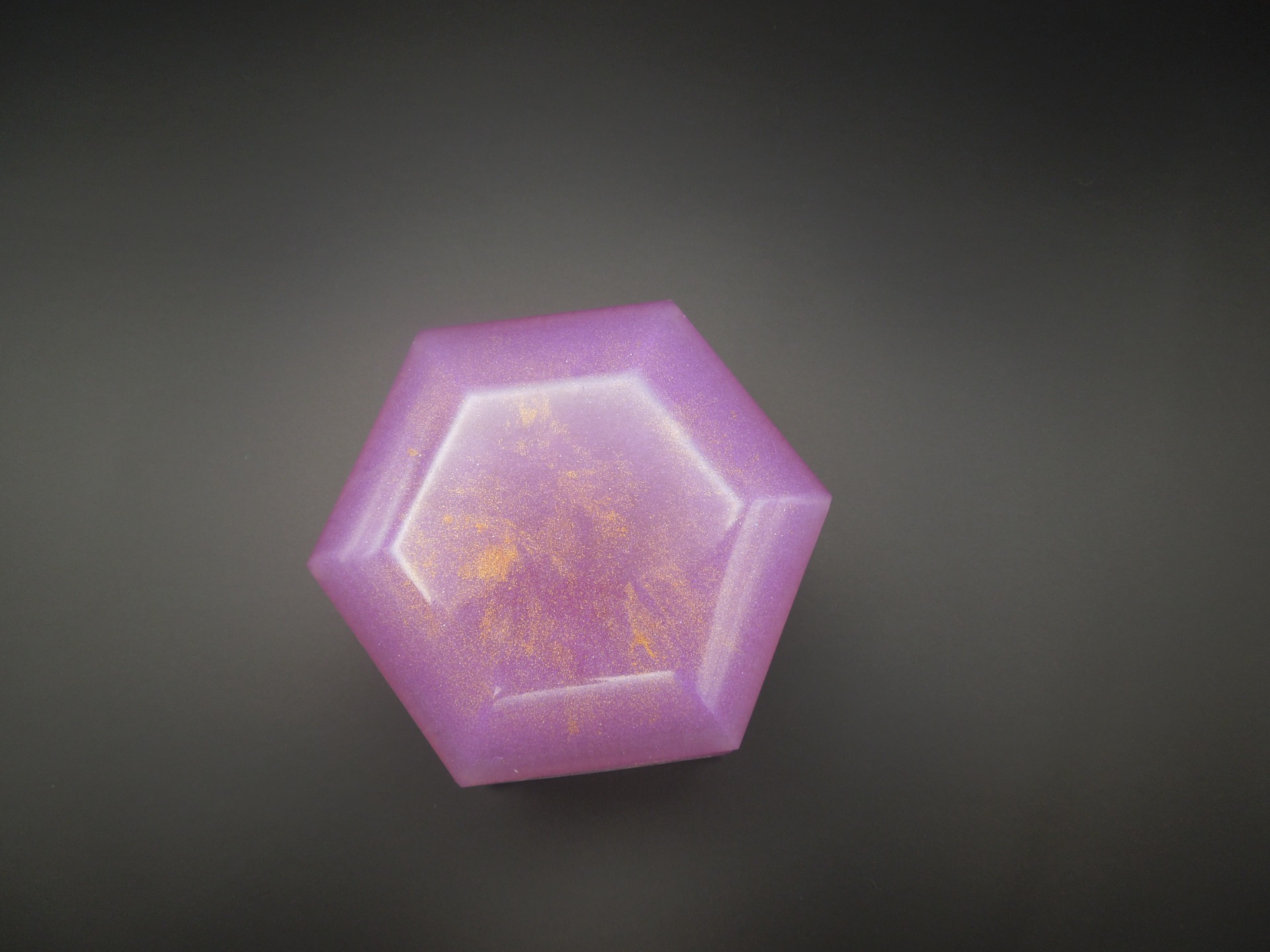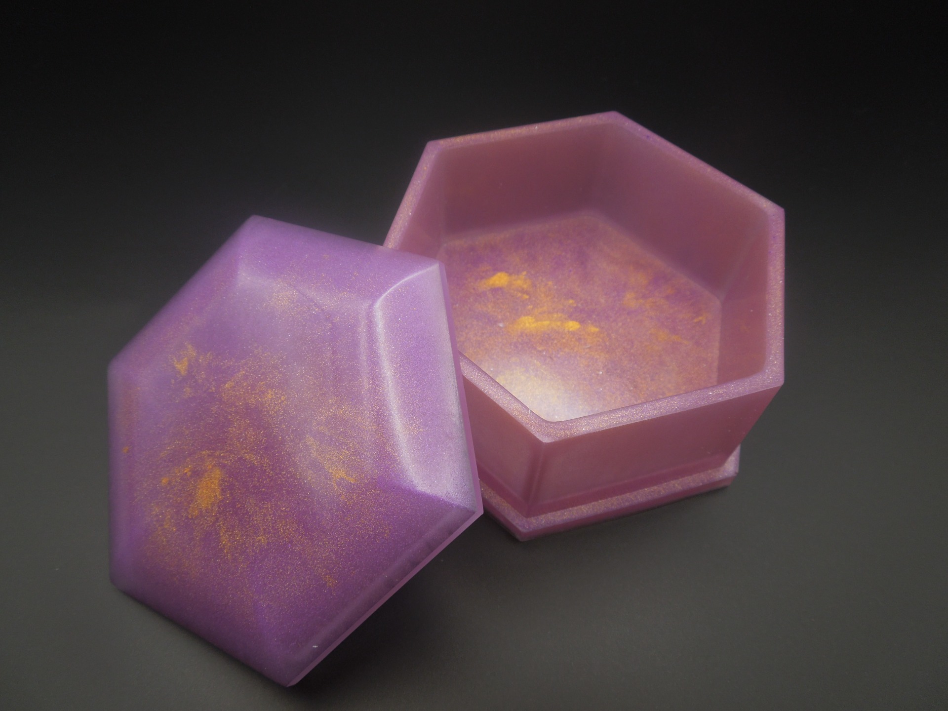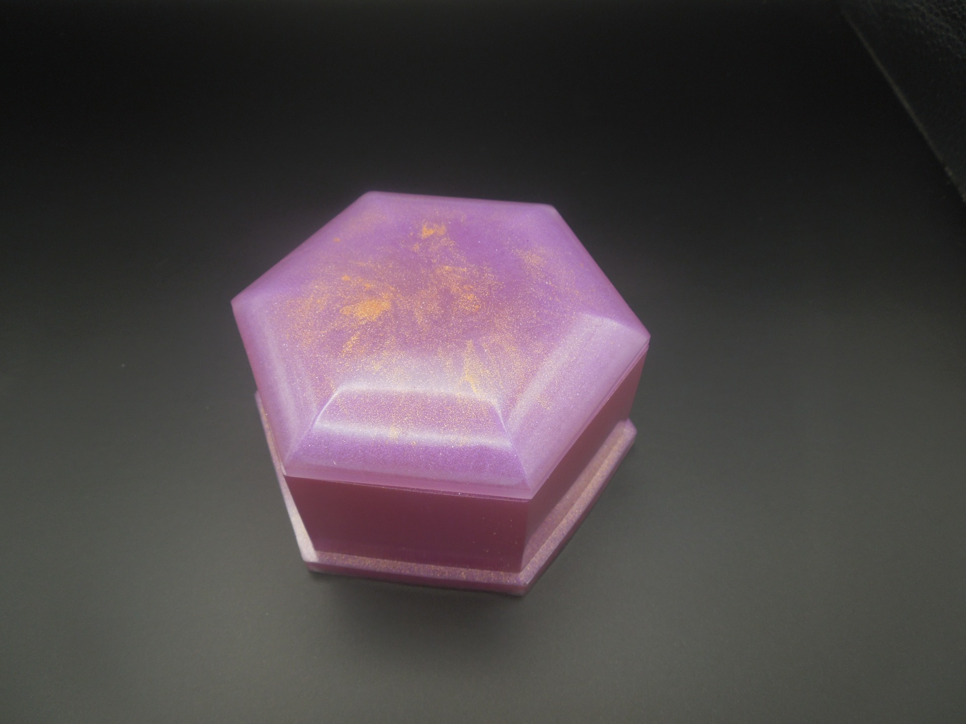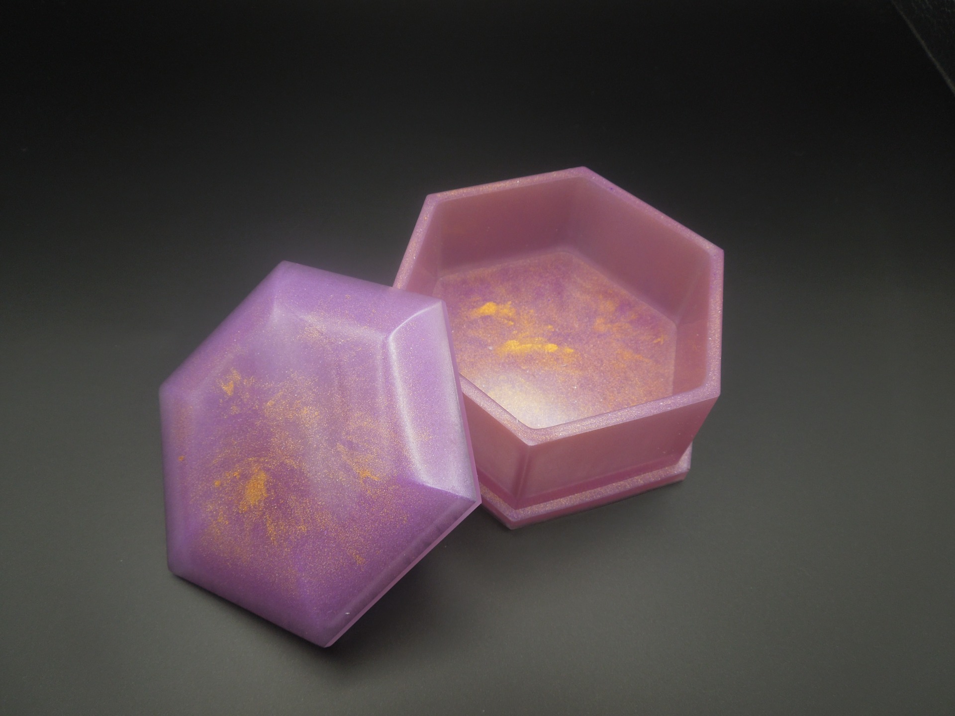 Dodejte svým pokladům místo, které si zaslouží. Tato ručně odlévaná krabička z pryskyřice vás okouzlí svou hlubokou fialovou barvou a bohatým nánosem zlatých glitrů, které na světle vytvářejí nádherné odlesky. Díky svému geometrickému tvaru působí moderně a elegantně zároveň.